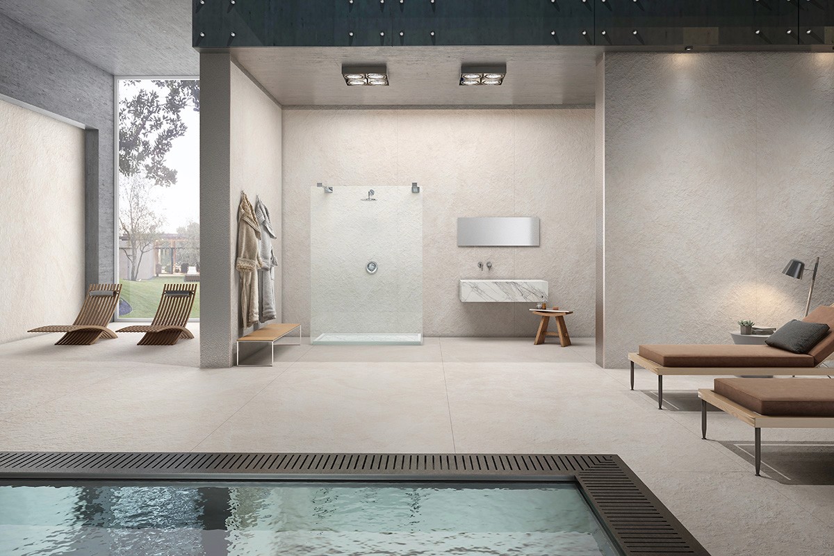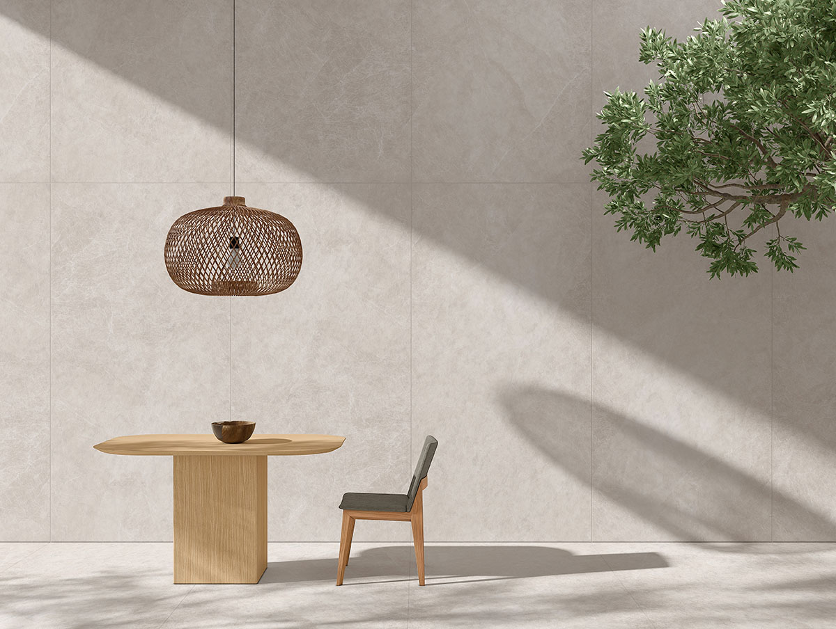 The tile's design features muted, ethereal tones, presenting a soft, light grey or beige base with subtle variations, reminiscent of the gentle smoke (Fumo) or mist that might shroud a contemplative garden. The delicate, organic veining on it's surface reinforces this sense of natural, understated beauty, evoking a profound feeling of calm and belonging. "MIDAS FUMO" is crafted to foster both peace and purpose, transforming any room into a haven of quiet contemplation.